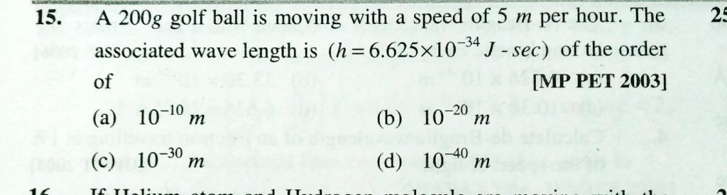 A 200g golf ball is moving with a speed of 5 m per hour. The associated wavelength is ( h = 6.625 x 10^-34 J/sec ) of the order of A 200g golf ball is moving with a speed of 5 m per hour. The associated wavelength is ( h = 6.625 x 10^-34 J/sec ) of the order of November 27, 2020 Category: Uncategorised (JEE Advanced Physics by BM Sharma + GMP Solutions) , Facebook Messenger WhatsApp Share this:TwitterFacebook Related