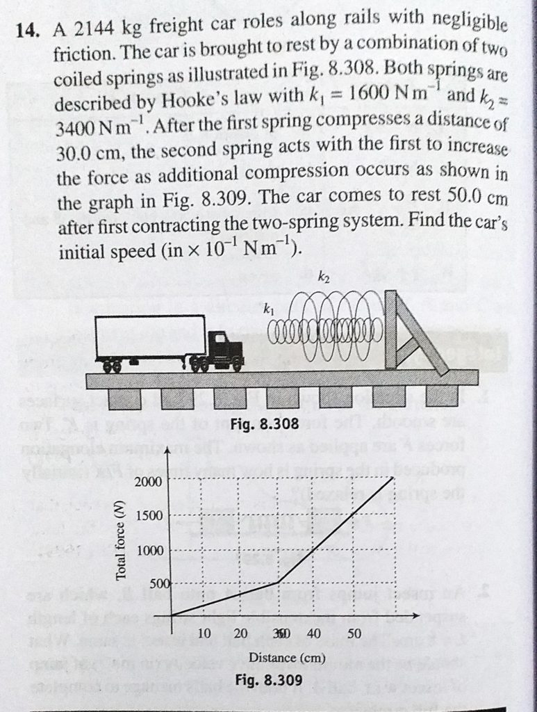 A 2144 kg freight car roles along rails with negligible friction. The car is brought to rest by a combination of two coiled springs as illustrated in Fig. 8.308. Both springs are described by Hooke’s law A man slowly pulls a bucket of water from a well of depth h = 20 m. The mass of the uniform rope and bucket full of water are m = 200 g and M 19.9 kg respectively. Find the work done by the man. October 5, 2020 Category: Uncategorised (JEE Advanced Physics by BM Sharma + GMP Solutions) , Facebook Messenger WhatsApp Share this:TwitterFacebook Related