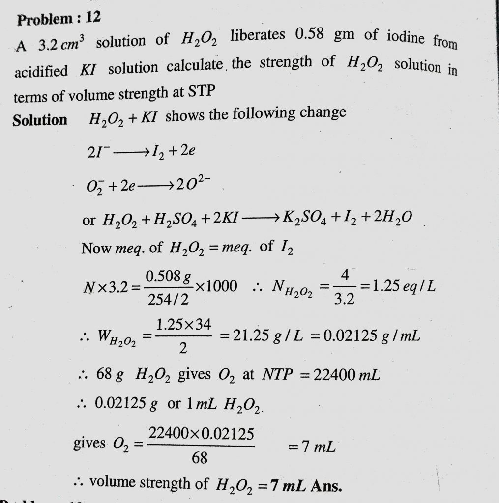 A 3.2 cm^3 solution of H2O2 liberates 0.58 gm of iodine from acidified KI solution calculate the strength of H2O2 solution in terms of volume strength at STP A 3.2 cm^3 solution of H2O2 liberates 0.58 gm of iodine from acidified KI solution calculate the strength of H2O2 solution in terms of volume strength at STP November 29, 2020 Category: Uncategorised (JEE Advanced Physics by BM Sharma + GMP Solutions) , Facebook Messenger WhatsApp Share this:TwitterFacebook Related