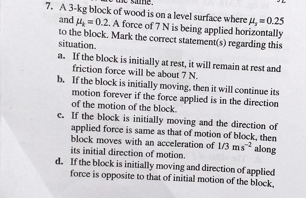 A 3 kg block of wood is on a level surface where mu s = 0.25 and mu k = 0.2. A force of 7 N is being applied horizontally to the block. Mark the correct statement(s) regarding this situation. A 3 kg block of wood is on a level surface where mu s = 0.25 and mu k = 0.2. A force of 7 N is being applied horizontally to the block. Mark the correct statement(s) regarding this situation. October 1, 2020 Category: Uncategorised (JEE Advanced Physics by BM Sharma + GMP Solutions) , Facebook Messenger WhatsApp Share this:TwitterFacebook Related