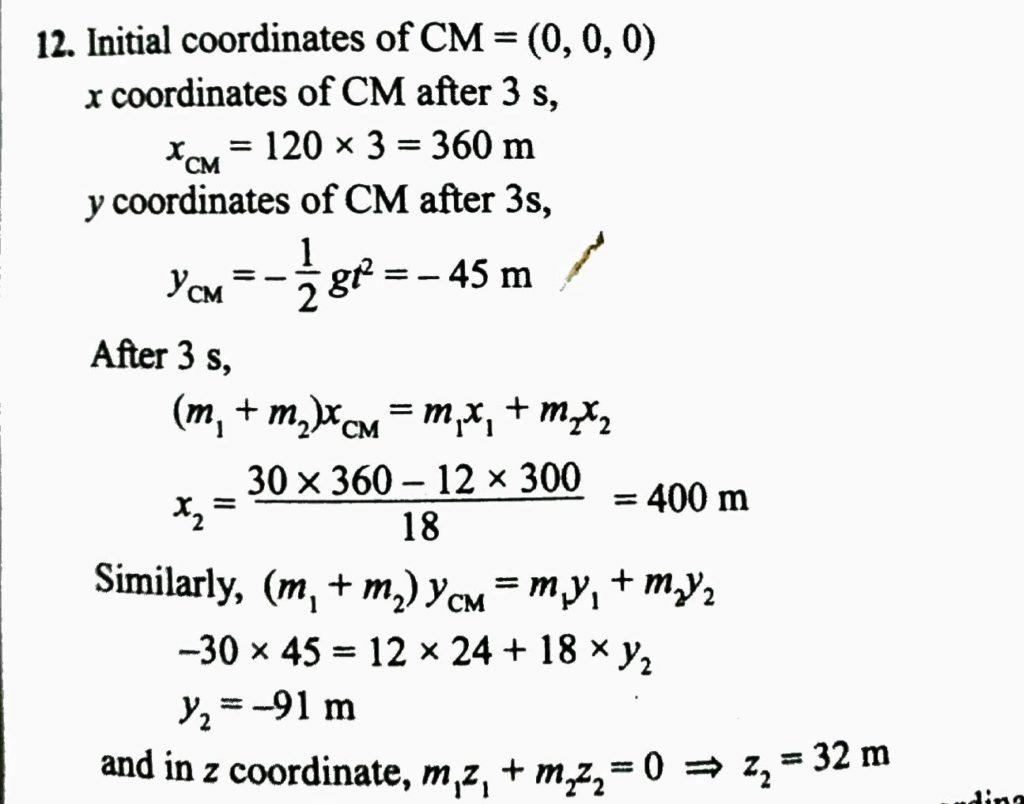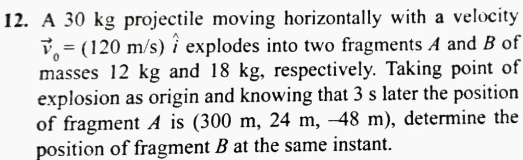 A `30 kg` projectile moving horizontally with a velocity `vecv_(0) = ( 120 m//s ) hati` explodes into two fragments `A` and `B` of masses `12 kg` and `8 kg`, respectively. Taking point of explosion as origin and knowing that `3s` later position of fragment a is (`300 m, 24 m, -48 m`), determine the position of fragment `B` at the instant.