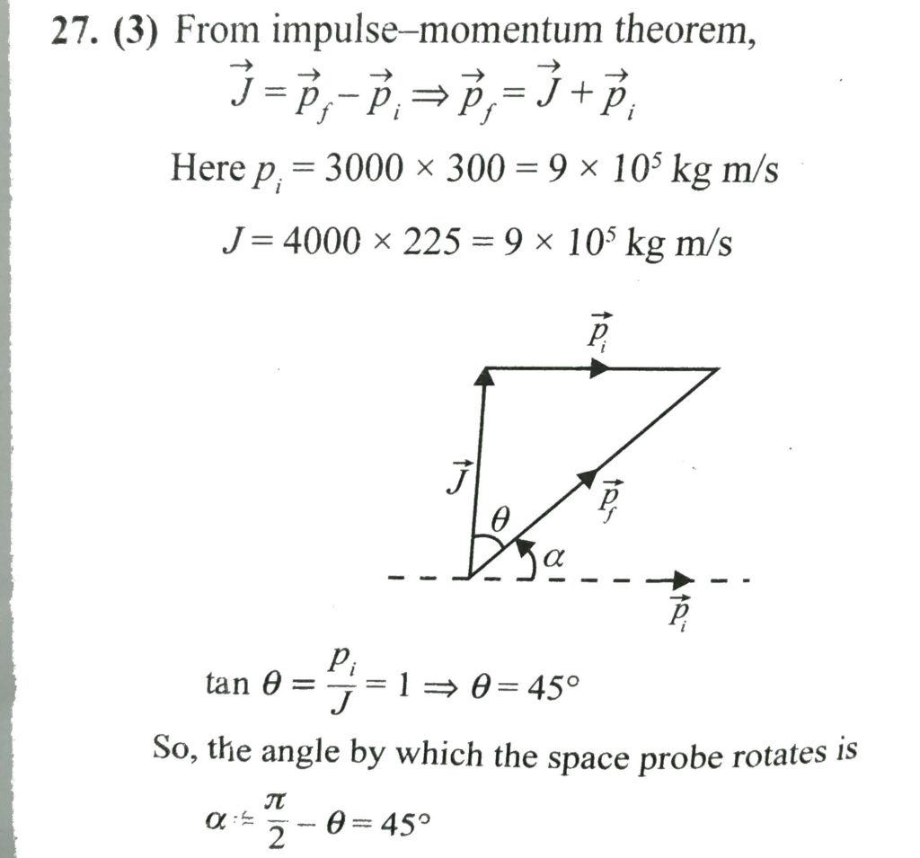A 3000 kg space probe is moving in a gravity free space at a constant velocity of 300 m/s. To change the direction of space probe, rockets have been fired in a direction perpendicular to the direction of initial motion of the space probe, the rocket firing exerts a thrust of 4000N for 225 s. The space probe will turn by an angle of (neglect the mass of the rockets fired)