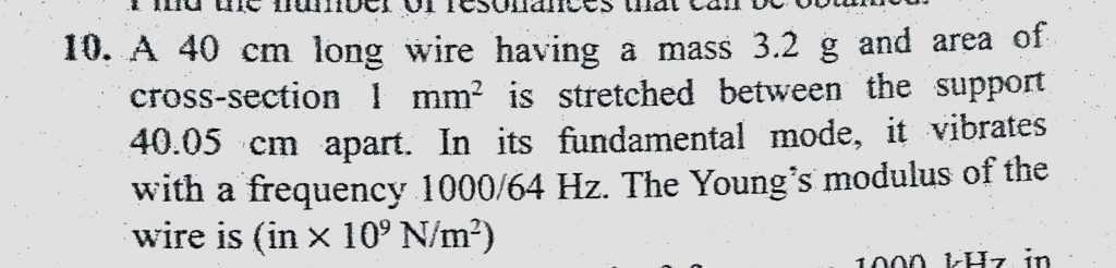 A 40 cm long wire having a mass 3.2 g and area of cross-section 1 mm^2 is stretched between the support 40.05 cm apart. In its fundamental mode, it vibrates with a frequency A 40 cm long wire having a mass 3.2 g and area of cross-section 1 mm^2 is stretched between the support 40.05 cm apart. In its fundamental mode it vibrates with a frequency November 6, 2020 Category: Uncategorised (JEE Advanced Physics by BM Sharma + GMP Solutions) , Facebook Messenger WhatsApp Share this:TwitterFacebook Related