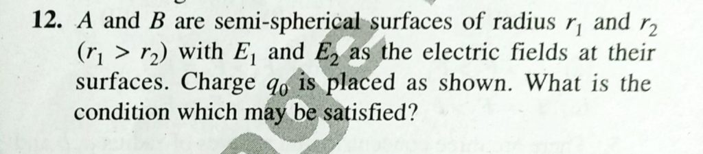 A and B are semi – spherical surfaces of radius r1 and r2( r1<r2) with E1 and E2 as the electric fields a the their surfaces. Charge q0 is placed as shown. What is the condition which may be statisfied ? E→=E0xiˆ. Consider an imaginary cubical volume of edge a with its sides parallel to the axes of coordinates. The charge inside this volume will be In a region of space the electric field in the x-direction and proportional to xi.e. September 17, 2020 Category: Uncategorised (JEE Advanced Physics by BM Sharma + GMP Solutions) , Facebook Messenger WhatsApp Share this:TwitterFacebook Related
