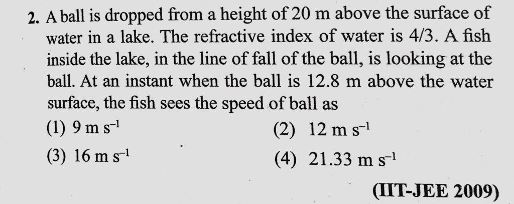 A ball is dropped from a height of 20 m above the surface of water in a lake. The refractive index of water is 4/3. A fish inside the lake, in the line of fall of the ball, is looking at the A ball is dropped from a height of 20 m above the surface of water in a lake. The refractive index of water is 4/3. A fish inside the lake in the line of fall of the ball is looking at the October 7, 2020 Category: Uncategorised (JEE Advanced Physics by BM Sharma + GMP Solutions) , Facebook Messenger WhatsApp Share this:TwitterFacebook Related