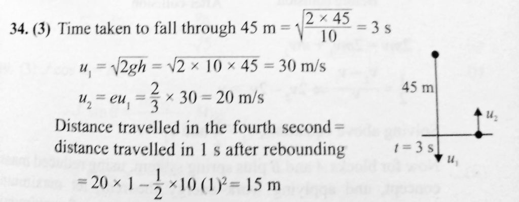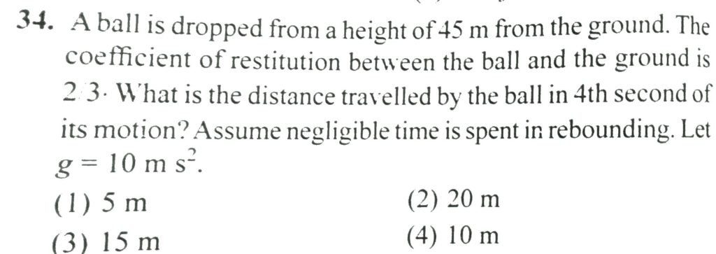 A ball is dropped from a height of 45 m from the ground. The coefficient of restitution between the ball and the ground is 23. What is the distance travelled by the ball in 4th second of its motion. Assume negligible time is spent in rebounding. Let g=10 m s^2
