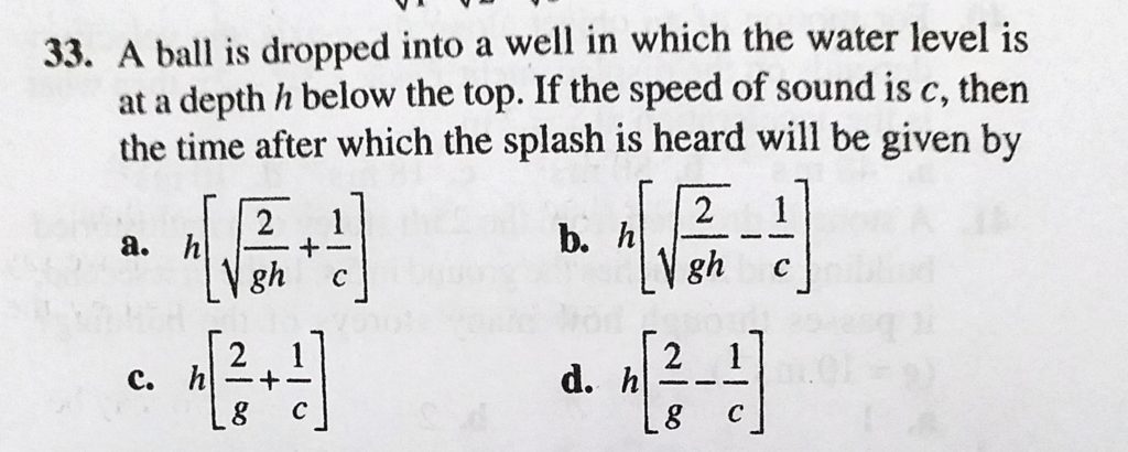 A ball is dropped into a well in which the water level is at a depth h below the top. If the speed of sound is c, then the time after which the splash is heard will be given by A ball is dropped into a well in which the water level is at a depth h below the top. If the speed of sound is c then the time after which the splash is heard will be given by September 19, 2020 Category: Uncategorised (JEE Advanced Physics by BM Sharma + GMP Solutions) , Facebook Messenger WhatsApp Share this:TwitterFacebook Related