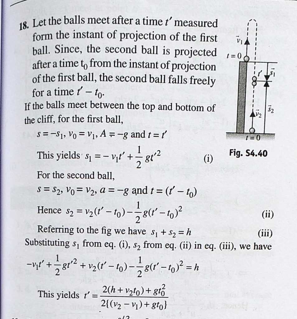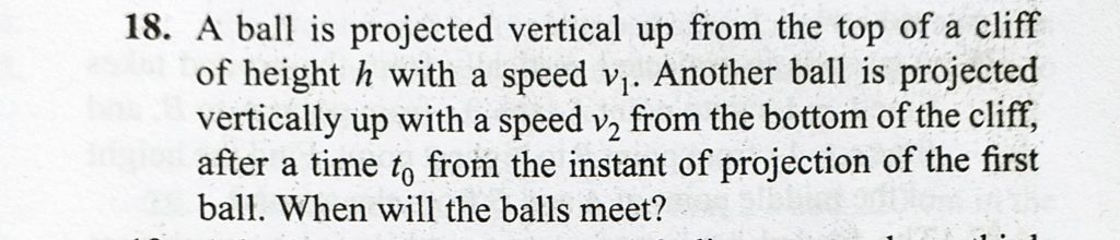 A ball is projected vertical up from the top of a cliff of height h with a speed v 1 . Another ball is projected vertically up with a speed v2 from the bottom of the cliff, after a time t0 from the instant A ball is projected vertical up from the top of a cliff of height h with a speed v 1 . Another ball is projected vertically up with a speed v2 from the bottom of the cliff after a time t0 from the instant September 18, 2020 Category: Uncategorised (JEE Advanced Physics by BM Sharma + GMP Solutions) , Facebook Messenger WhatsApp Share this:TwitterFacebook Related