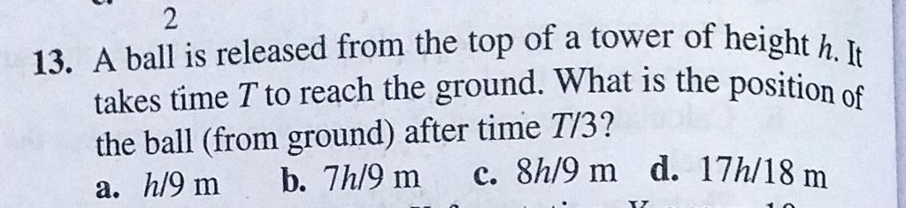 A ball is released form the top of a tower of height h. It takes time T to reach the ground. What is the position of the ball ( from ground) after time T/3? A ball is released form the top of a tower of height h. It takes time T to reach the ground. What is the position of the ball ( from ground) after time T/3? September 19, 2020 Category: Uncategorised (JEE Advanced Physics by BM Sharma + GMP Solutions) , Facebook Messenger WhatsApp Share this:TwitterFacebook Related
