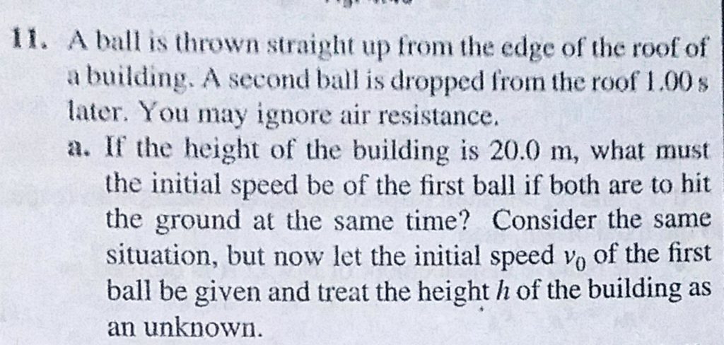 A ball is thrown straight up from the edge of the roof of a building. A second ball is dropped from the roof 1.00 s later. You may ignore air resistance. a. If the height of the building is 20.0 m, what must the initial speed be of the first ball if both are to hit the ground at the same time?