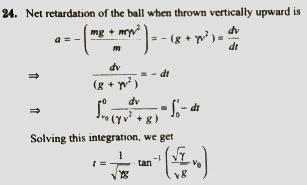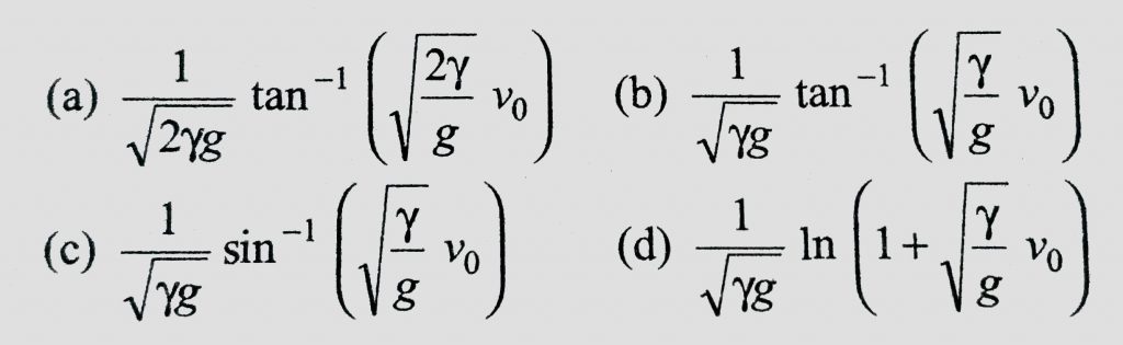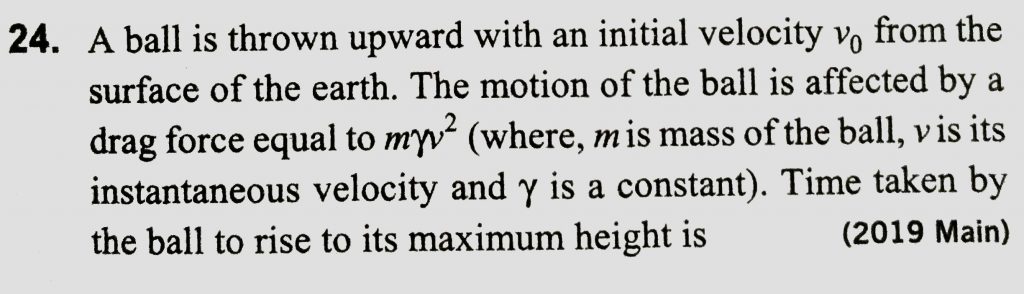 A ball is thrown upward with an initial velocity V 0 from the surface of the earth. The motion of the ball is affected by a drag force equal to mγv 2 (where m is mass of the ball, v is its instantaneous velocity and γ is a constant). Time taken by the ball to rise to its maximum height is