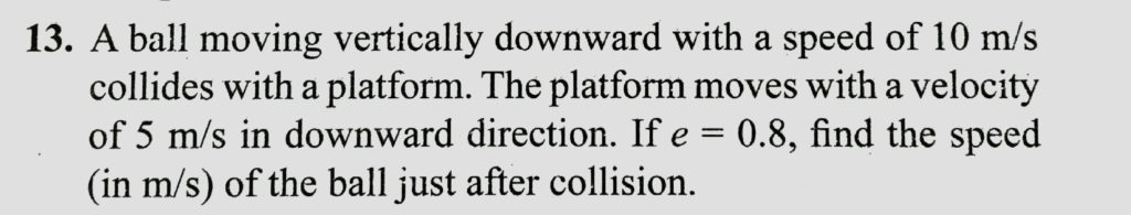 A ball moving vertically downward with a speed of 10 m/s collides with a platform. The platform moves with a velocity of 5m/s in downward direction. If e = 0.8, find the speed (in m/s ) of the ball just after collision. A ball moving vertically downward with a speed of 10 m/s collides with a platform. The platform moves with a velocity of 5m/s in downward direction. If e = 0.8 find the speed (in m/s ) of the ball just after collision. September 24, 2020 Category: Uncategorised (JEE Advanced Physics by BM Sharma + GMP Solutions) , Facebook Messenger WhatsApp Share this:TwitterFacebook Related