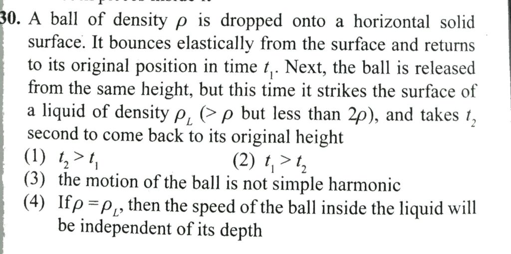 A ball of density rho is dropped on to a horizontal solid surface. It bounces elastically from the surface and returns to its original position in a time t1. Next, the ball is released from the same height but this time it strikes the surface of a liquid of density rhoL ( > rho but less than 2rho ), and takes t2 second to come back to its original height