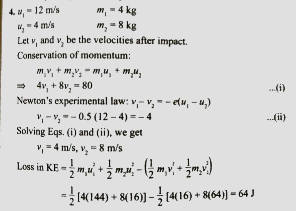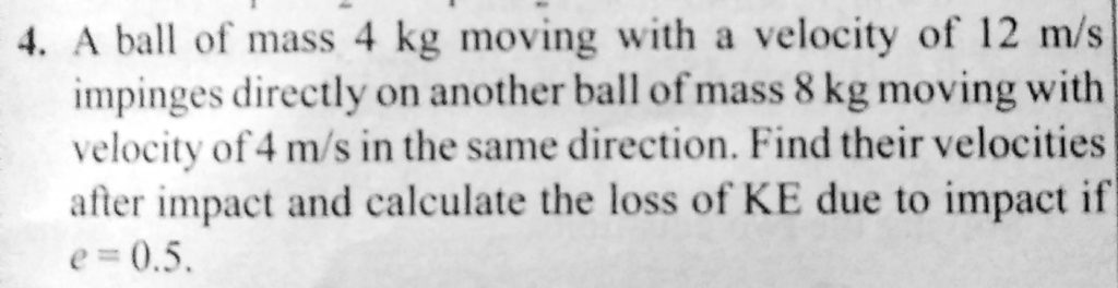 A ball of mass 4 kg moving with a velocity of 12 m/s impinges directly on another ball of mass 8 kg moving with velocity of 4 m/s in the same direction. Find their velocities after impact and calculate the loss of KE due to impact if e = 0.5. A mass m1 moves with a great velocity. It strikes another mass m2 at rest in head-on collision. It comes back along its path with low speed after collision. Then find out whether m1m2. September 22, 2020 Category: Uncategorised (JEE Advanced Physics by BM Sharma + GMP Solutions) , Facebook Messenger WhatsApp Share this:TwitterFacebook Related