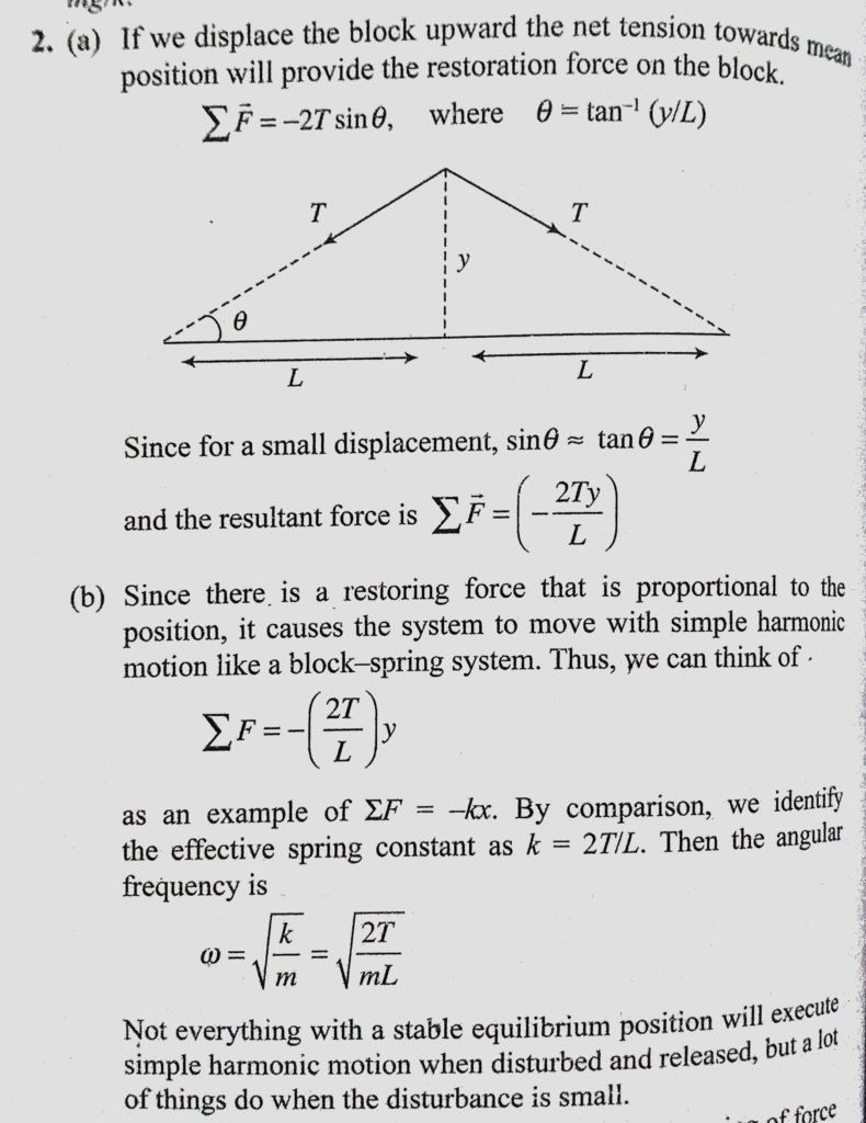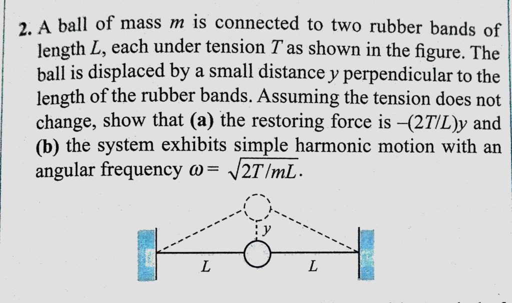 A ball of mass m is connected to two rubber bands of length L, each under tension T as shown in the figure. The ball is displaced by a small distance y perpendicular to the length A ball of mass m is connected to two rubber bands of length L each under tension T as shown in the figure. The ball is displaced by a small distance y perpendicular to the length October 30, 2020 Category: Uncategorised (JEE Advanced Physics by BM Sharma + GMP Solutions) , Facebook Messenger WhatsApp Share this:TwitterFacebook Related