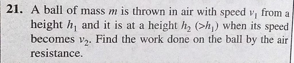 A ball of mass m is thrown in air with speed v1 from a height h1 and it is at a height h2 (>h1) when its speed becomes v2. Find the work done on the ball by the air resistance. A ball of mass m is thrown in air with speed v1 from a height h1 and it is at a height h2 (>h1) when its speed becomes v2. Find the work done on the ball by the air resistance. October 2, 2020 Category: Uncategorised (JEE Advanced Physics by BM Sharma + GMP Solutions) , Facebook Messenger WhatsApp Share this:TwitterFacebook Related