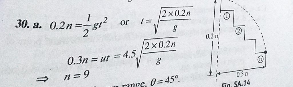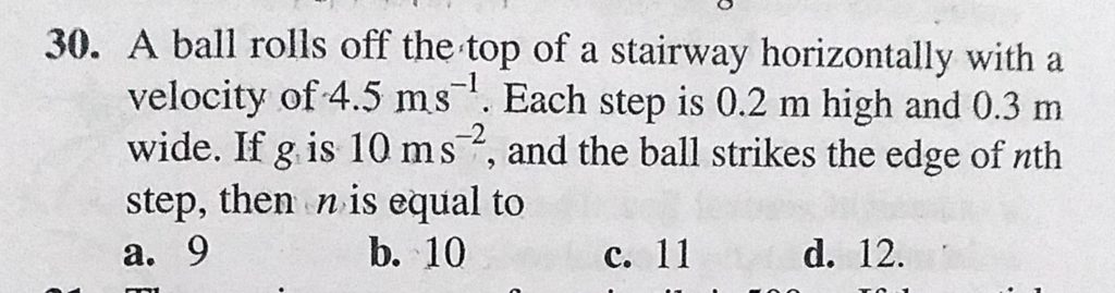 A ball rolls off the top of a stairway horizontally with a velocity of 4.5 m/s. Each step is 0.2 m high and 0.3 m wide. If g is 10 m/s^2, and the ball strikes the edge of nth step, then n is equal to A ball rolls off the top of a stairway horizontally with a velocity of 4.5 m/s. Each step is 0.2 m high and 0.3 m wide. If g is 10 m/s^2 and the ball strikes the edge of nth step then n is equal to September 24, 2020 Category: Uncategorised (JEE Advanced Physics by BM Sharma + GMP Solutions) , Facebook Messenger WhatsApp Share this:TwitterFacebook Related