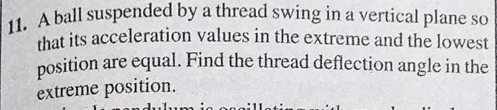 A ball suspended by a thread swing in a vertical plane so that its acceleration values in the extreme and the lowest position are equal. Find the thread deflection angle in the extreme position. A ball suspended by a thread swing in a vertical plane so that its acceleration values in the extreme and the lowest position are equal. Find the thread deflection angle in the extreme position. September 30, 2020 Category: Uncategorised (JEE Advanced Physics by BM Sharma + GMP Solutions) , Facebook Messenger WhatsApp Share this:TwitterFacebook Related