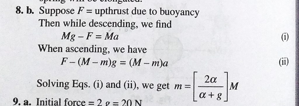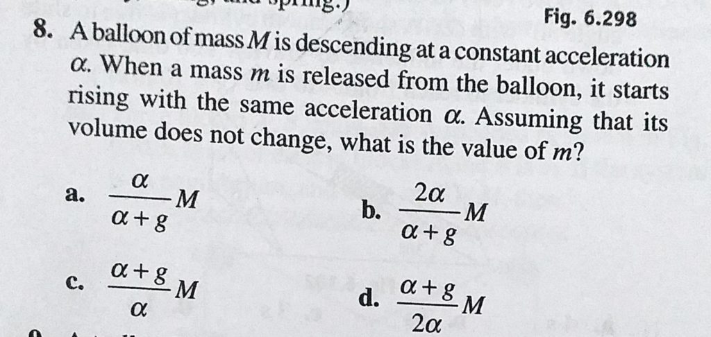 A balloon of mass M is descending at a constant acceleration alpha. When a mass m is released from the balloon, it starts rising with the same acceleration alpha. Assuming that its volume A balloon of mass M is descending at a constant acceleration alpha. When a mass m is released from the balloon it starts rising with the same acceleration alpha. Assuming that its volume September 29, 2020 Category: Uncategorised (JEE Advanced Physics by BM Sharma + GMP Solutions) , Facebook Messenger WhatsApp Share this:TwitterFacebook Related