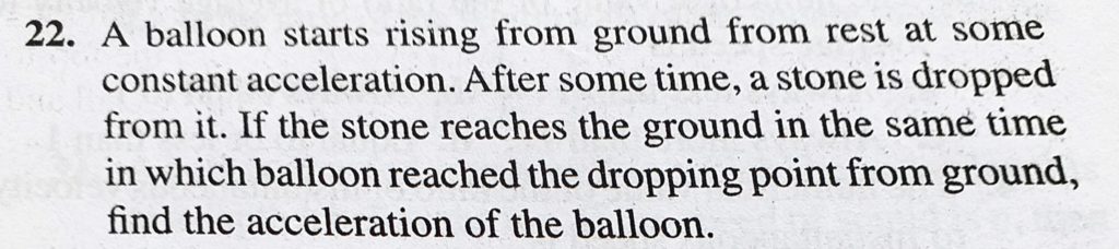 A balloon starts rising from ground from rest at some constant acceleration. After some time, a stone is dropped form it. If the stone reaches the ground in the same time in which balloon reached the A balloon starts rising from ground from rest at some constant acceleration. After some time a stone is dropped form it. If the stone reaches the ground in the same time in which balloon reached the September 18, 2020 Category: Uncategorised (JEE Advanced Physics by BM Sharma + GMP Solutions) , Facebook Messenger WhatsApp Share this:TwitterFacebook Related
