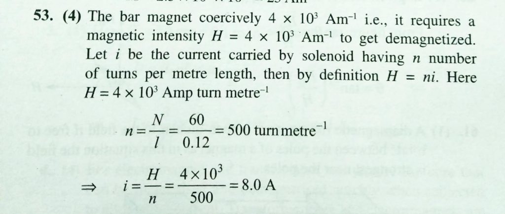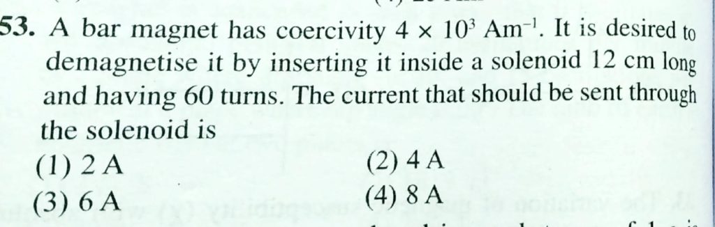 A bar magnet has coercivity 4 × 10^3 A/m. It is desired to demagnetise it by inserting it inside a solenoid 12cm long and having 60 turns. The current that should be sent through the solenoid is A bar magnet has coercivity 4 × 10^3 A/m. It is desired to demagnetise it by inserting it inside a solenoid 12cm long and having 60 turns. The current that should be sent through the solenoid is October 18, 2020 Category: Uncategorised (JEE Advanced Physics by BM Sharma + GMP Solutions) , Facebook Messenger WhatsApp Share this:TwitterFacebook Related