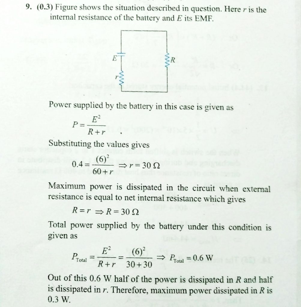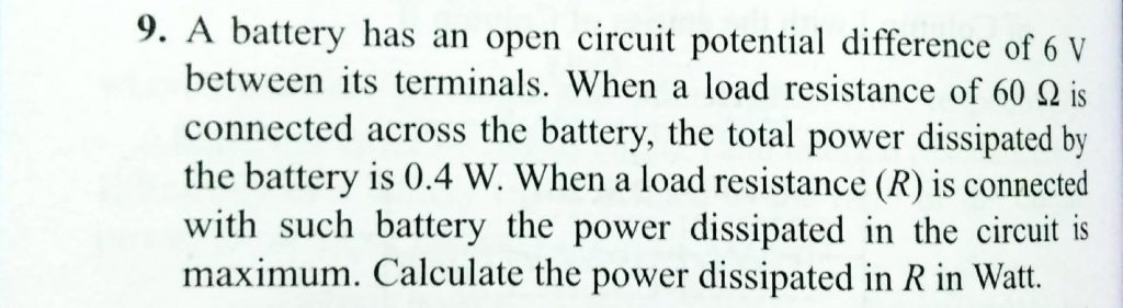 A battery has an open circuit potential difference of 6V between its terminals. When a load resistance of 60Ω is connected across the battery,the total power supplied by the bttery is 0.4W. What should be the load resistance R, so that maximum power will be dissipated in R. Calculated this power. What is the total power supplied by the battery when such a load is connected?
