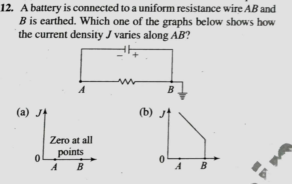 A battery is connected to a uniform resistance wire AB and B is earthed. Which one of the graphs below shows how the current density J varies along AB ? A battery is connected to a uniform resistance wire AB and B is earthed. Which one of the graphs below shows how the current density J varies along AB ? September 19, 2020 Category: Uncategorised (JEE Advanced Physics by BM Sharma + GMP Solutions) , Facebook Messenger WhatsApp Share this:TwitterFacebook Related
