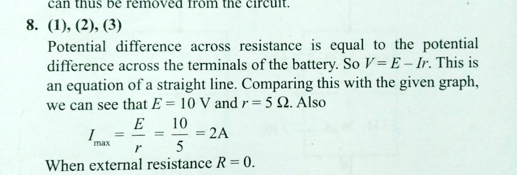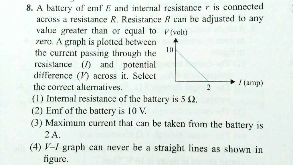 A battery of emf E and internal resistance r is connected across a resistance R. Resistance R can be adjusted to any value greater then or equla to zero. A graph is plotted between the current passing through the resistance (I) and potential (V) across it. Select the correct alternatives.
