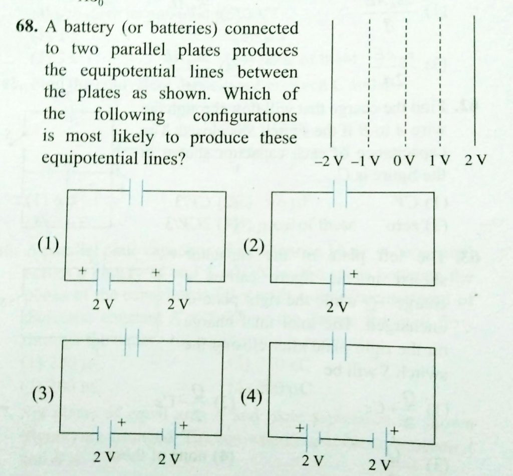 A battery (or batteries) connected to two parallel plates produces the equipotential lines between the plates as shown. Which of the following configurations is most likely to produce these equipotential lines? are placed parallel to each other at a distance d. One plate is connected to a battery of emf E and its negative is earthed. The other plate is also earthed. The charge drawn by plate is each of area A Two plates November 8, 2020 Category: Uncategorised (JEE Advanced Physics by BM Sharma + GMP Solutions) , Facebook Messenger WhatsApp Share this:TwitterFacebook Related
