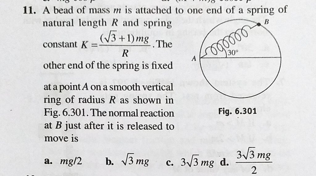 A bead of mass m is attached to one end of a spring of natural length R and spring constant K = (root 3 + 1) mg / R. The other end of the spring is fixed at a point A on a smooth vertical A bead of mass m is attached to one end of a spring of natural length R and spring constant K = (root 3 + 1) mg / R. The other end of the spring is fixed at a point A on a smooth vertical September 29, 2020 Category: Uncategorised (JEE Advanced Physics by BM Sharma + GMP Solutions) , Facebook Messenger WhatsApp Share this:TwitterFacebook Related