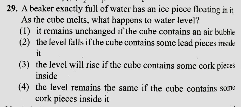A beaker exactly full of water has an ice piece floating in it. As the cube melts , what happens to water level? A beaker exactly full of water has an ice piece floating in it. As the cube melts what happens to water level? October 8, 2020 Category: Uncategorised (JEE Advanced Physics by BM Sharma + GMP Solutions) , Facebook Messenger WhatsApp Share this:TwitterFacebook Related