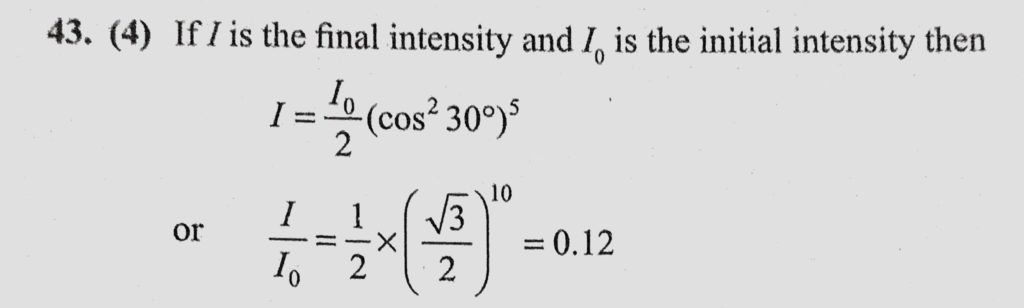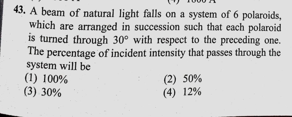 A beam of natural light falls on a system of 6 polaroids, which are arranged in succession such that each polaroid is turned through 30 with respect to the preceding one. The percentage A beam of natural light falls on a system of 6 polaroids which are arranged in succession such that each polaroid is turned through 30 with respect to the preceding one. The percentage October 12, 2020 Category: Uncategorised (JEE Advanced Physics by BM Sharma + GMP Solutions) , Facebook Messenger WhatsApp Share this:TwitterFacebook Related