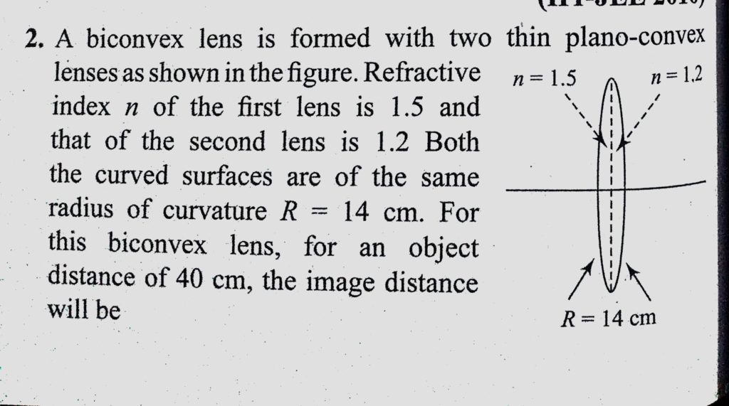 A biconvex lens is formed with two thin plano-convex lenses as shown in the figure. Refractive index n of the first lens is 1.5 and that of the second lens is 1.2 Both the curved surfaces A biconvex lens is formed with two thin plano-convex lenses as shown in the figure. Refractive index n of the first lens is 1.5 and that of the second lens is 1.2 Both the curved surfaces October 9, 2020 Category: Uncategorised (JEE Advanced Physics by BM Sharma + GMP Solutions) , Facebook Messenger WhatsApp Share this:TwitterFacebook Related