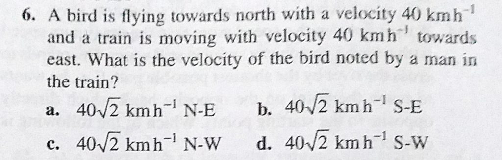 A bird is flying towards north with a velocity 40 km/h and a train is moving with velocity 40 km/h towards east. What is the velocity of the bird noted by a man in the train? A bird is flying towards north with a velocity 40 km/h and a train is moving with velocity 40 km/h towards east. What is the velocity of the bird noted by a man in the train? September 22, 2020 Category: Uncategorised (JEE Advanced Physics by BM Sharma + GMP Solutions) , Facebook Messenger WhatsApp Share this:TwitterFacebook Related