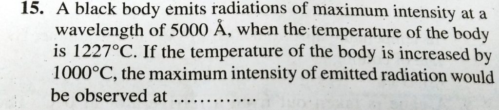 A Black body emits radiations of maximum intensity at a wavelength of 5000 A, when the temperature of the body is 1227 degree C. If the body is increased by 1000 degree C, the maximum intensity of emitted radiation would be observed at………….. A Black body emits radiations of maximum intensity at a wavelength of 5000 A the maximum intensity of emitted radiation would be observed at.............. when the temperature of the body is 1227 degree C. If the body is increased by 1000 degree C October 4, 2020 Category: Uncategorised (JEE Advanced Physics by BM Sharma + GMP Solutions) , Facebook Messenger WhatsApp Share this:TwitterFacebook Related