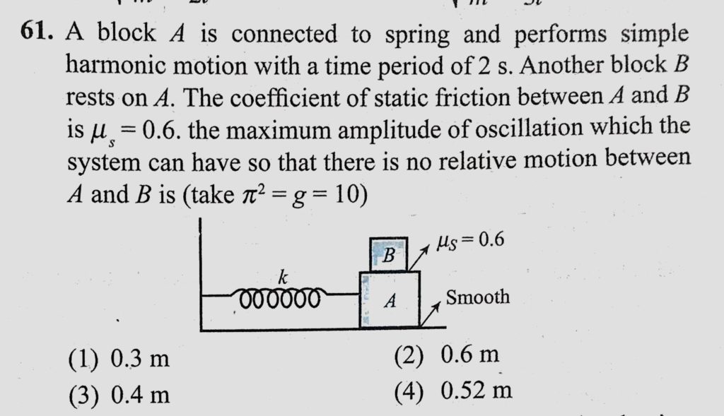 A block A is connected to spring and performs simple harmonic motion with a time period of 2 s. Another block B rests on A. The coefficient of static friction between A and B is A block A is connected to spring and performs simple harmonic motion with a time period of 2 s. Another block B rests on A. The coefficient of static friction between A and B is October 31, 2020 Category: Uncategorised (JEE Advanced Physics by BM Sharma + GMP Solutions) , Facebook Messenger WhatsApp Share this:TwitterFacebook Related
