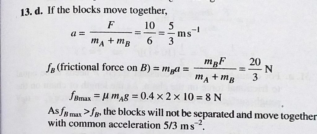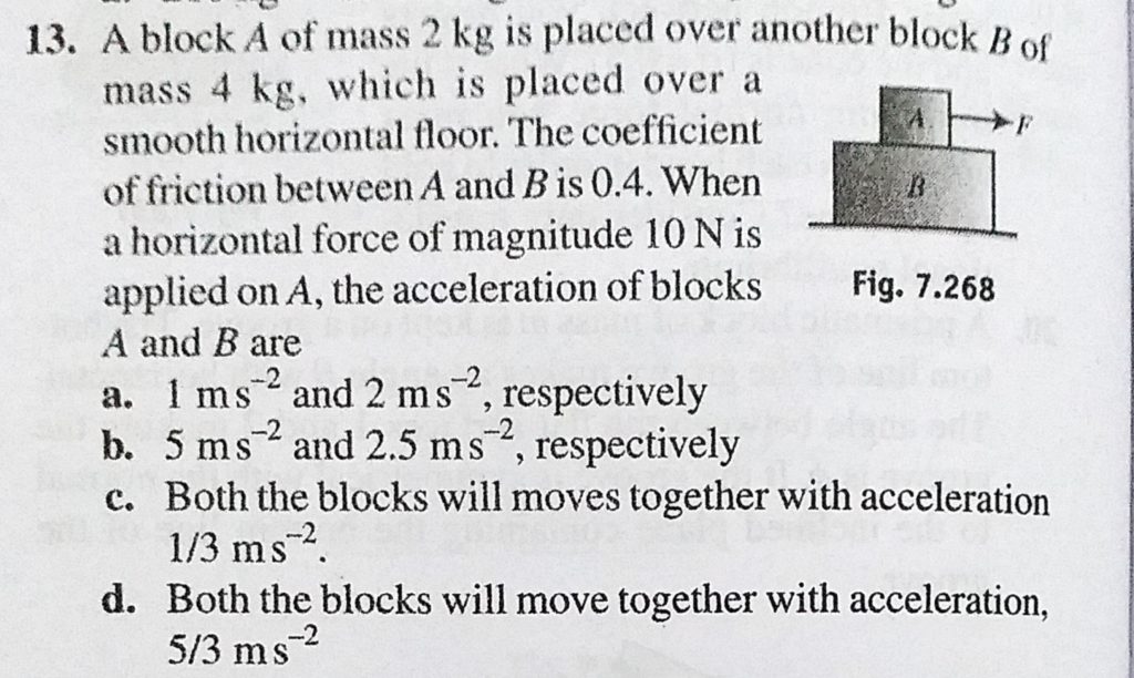 A block A of mass 2 kg is placed over another block B of mass 4 kg, which is placed over a smooth horizontal floor. The coefficient of friction between A and B is 0.4. When a horizontal force of magnitude A block A of mass 2 kg is placed over another block B of mass 4 kg which is placed over a smooth horizontal floor. The coefficient of friction between A and B is 0.4. When a horizontal force of magnitude October 1, 2020 Category: Uncategorised (JEE Advanced Physics by BM Sharma + GMP Solutions) , Facebook Messenger WhatsApp Share this:TwitterFacebook Related