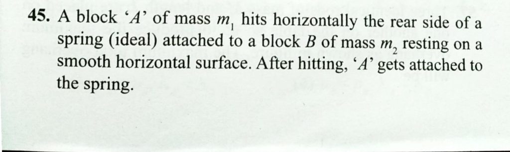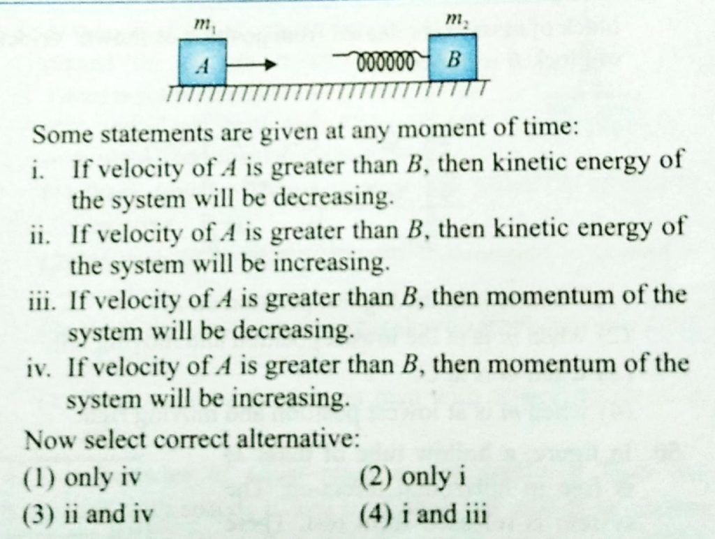 A block ‘A’ of mass m1 hits horizontally the rear side of a spring (ideal) attached to a block B of mass m^2 resting on a smooth horizontal surface. After hitting, ‘A’ gets attached to the spring. Some statements are given at any moment of time: i. If velocity of A is greater than B, then kinetic energy of the system will be decreasing. ii. If velocity of A is greater than B, then kinetic energy of the system will be increasing. iii. If velocity of A is greater than B, then momentum of the system will be decreasing. iv. If velocity of A is greater than B, then momentum of the system will be increasing. Now select correct alternative: