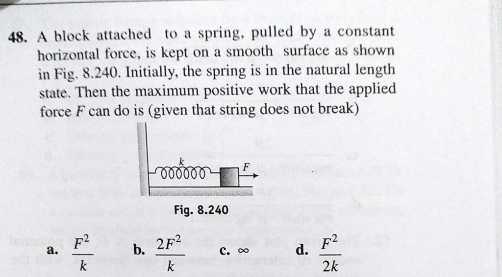 A block attached to a spring, pulled by a constant horizontal force, is kept on a smooth surface as shown in Fig. 8.240. Initially, the spring is in the natural length state. Then the maximum positive A block attached to a spring is kept on a smooth surface as shown in Fig. 8.240. Initially pulled by a constant horizontal force the spring is in the natural length state. Then the maximum positive October 4, 2020 Category: Uncategorised (JEE Advanced Physics by BM Sharma + GMP Solutions) , Facebook Messenger WhatsApp Share this:TwitterFacebook Related