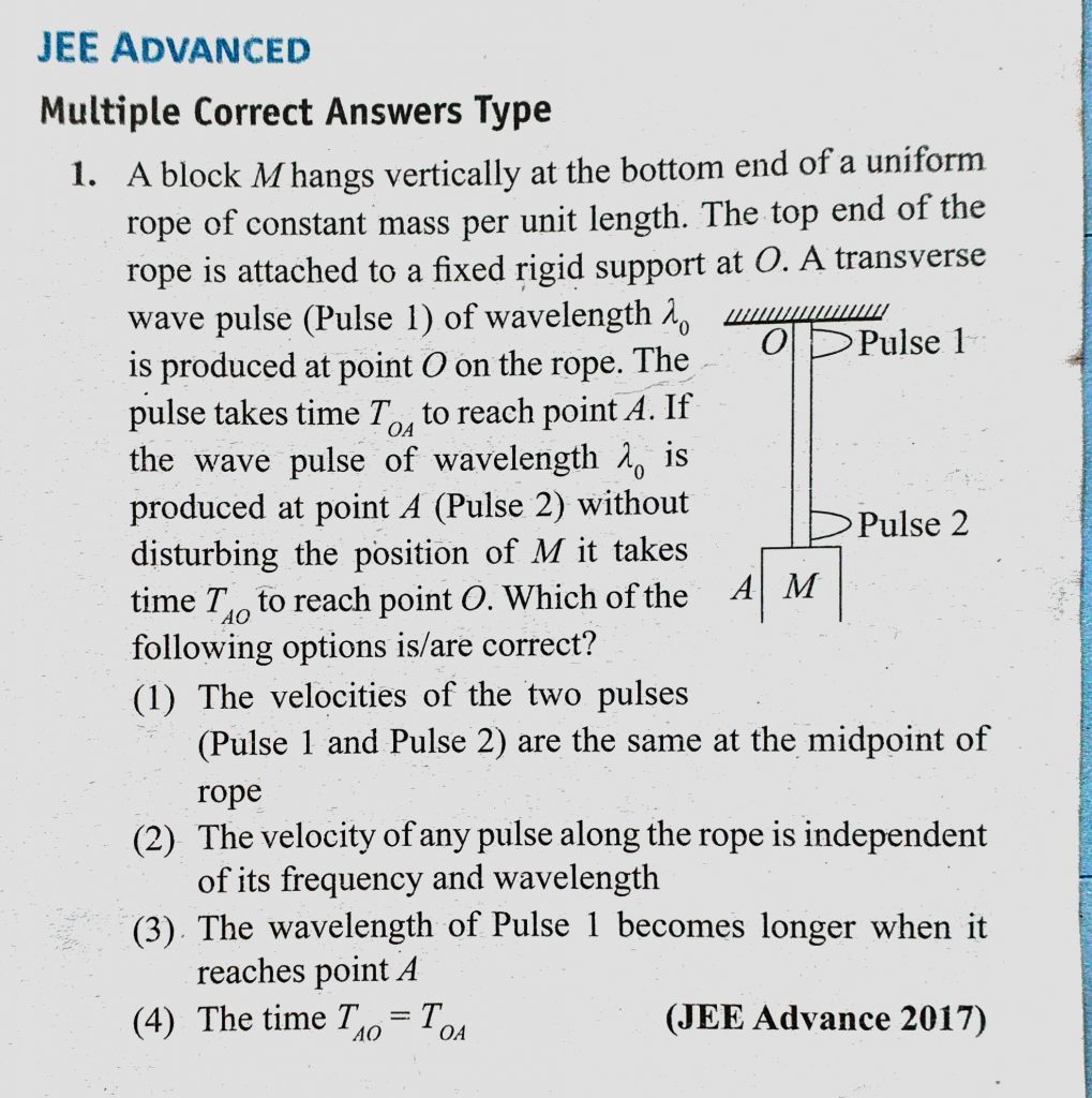 A block M hangs vertically at the bottom end of a uniform rope of constant mass per unit length. The top end of the rope is attached to a fixed rigid support at O. A transverse wave pulse A block M hangs vertically at the bottom end of a uniform rope of constant mass per unit length. The top end of the rope is attached to a fixed rigid support at O. A transverse wave pulse November 5, 2020 Category: Uncategorised (JEE Advanced Physics by BM Sharma + GMP Solutions) , Facebook Messenger WhatsApp Share this:TwitterFacebook Related