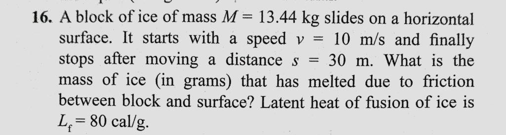 A block of ice of mass M = 13.44 kg slides on a horizontal surface. It starts with a speed v = 10 m/s and finally stops after moving a distance s = 30 m. What is the mass of ice A block of ice of mass M = 13.44 kg slides on a horizontal surface. It starts with a speed v = 10 m/s and finally stops after moving a distance s = 30 m. What is the mass of ice October 24, 2020 Category: Uncategorised (JEE Advanced Physics by BM Sharma + GMP Solutions) , Facebook Messenger WhatsApp Share this:TwitterFacebook Related