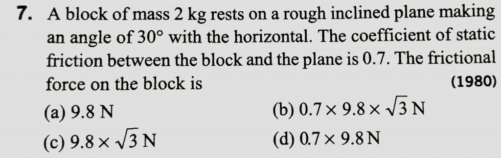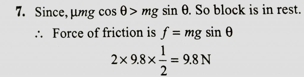 A block of mass 2 kg rests on a rough inclined plane making an angle of 30 o with the horizontal. The coefficient of static friction between the block and the plane is 0.7. The frictional force on the block is A block of mass 1 kg lies on a horizontal surface in a truck. The coefficient of static friction between the block and the surface is 0.6. If the acceleration of the truck is 5ms −2 the frictional force acting on the block is ...............N. February 14, 2021 Category: Uncategorised (JEE Advanced Physics by BM Sharma + GMP Solutions) , Facebook Messenger WhatsApp Share this:TwitterFacebook Related