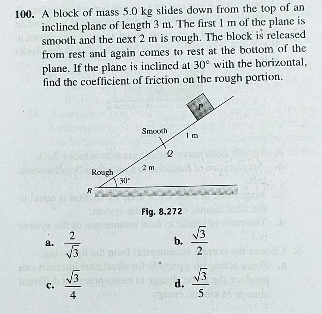 A block of mass 5.0 kg slides down from the top of an inclined plane of length 3 m. The first 1 m of the plane is smooth and the next 2 m is rough. The block is released from rest and A block of mass 5.0 kg slides down from the top of an inclined plane of length 3 m. The first 1 m of the plane is smooth and the next 2 m is rough. The block is released from rest and October 4, 2020 Category: Uncategorised (JEE Advanced Physics by BM Sharma + GMP Solutions) , Facebook Messenger WhatsApp Share this:TwitterFacebook Related
