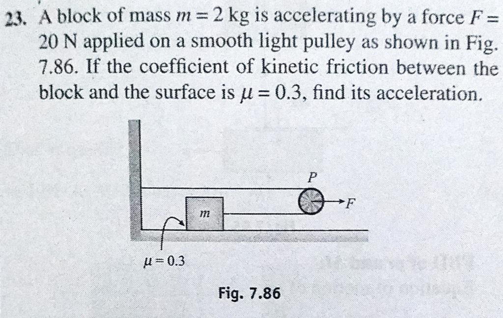 A block of mass m = 2 kg is accelerating by a force F = 20 N applied on a smooth light pulley as shown in Fig. 7.86. If the coefficient of kinetic friction between the block and the surface A block of mass m = 2 kg is accelerating by a force F = 20 N applied on a smooth light pulley as shown in Fig. 7.86. If the coefficient of kinetic friction between the block and the surface September 30, 2020 Category: Uncategorised (JEE Advanced Physics by BM Sharma + GMP Solutions) , Facebook Messenger WhatsApp Share this:TwitterFacebook Related
