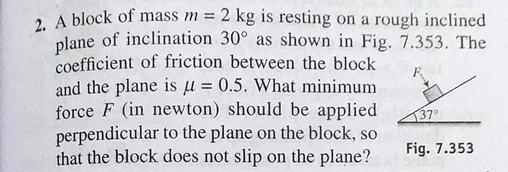 A block of mass m = 2 kg is resting on a rough inclined plane of inclination 30 as shown in Fig. 7.353. The coefficient of friction between the block and the plane is mu = 0.5. What minimum A block of mass m = 2 kg is resting on a rough inclined plane of inclination 30 as shown in Fig. 7.353. The coefficient of friction between the block and the plane is mu = 0.5. What minimum October 2, 2020 Category: Uncategorised (JEE Advanced Physics by BM Sharma + GMP Solutions) , Facebook Messenger WhatsApp Share this:TwitterFacebook Related