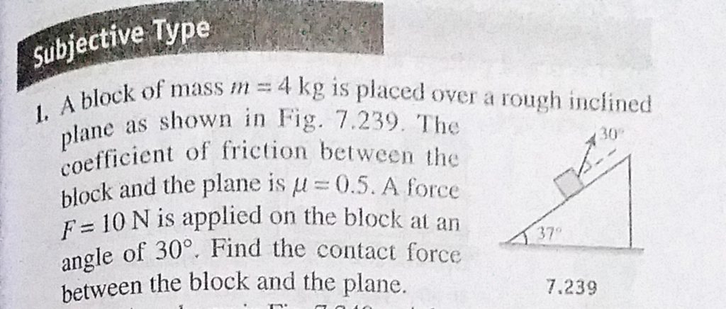 A block of mass m = 4 kg is placed over a rough inclined plane as shown in Fig. 7.239. The coefficient of friction between the block and the plane is mu = 0.5, A force F = 10 N is applied on the block at an angle of 30 A block of mass m = 4 kg is placed over a rough inclined plane as shown in Fig. 7.239. The coefficient of friction between the block and the plane is mu = 0.5 A force F = 10 N is applied on the block at an angle of 30 September 30, 2020 Category: Uncategorised (JEE Advanced Physics by BM Sharma + GMP Solutions) , Facebook Messenger WhatsApp Share this:TwitterFacebook Related