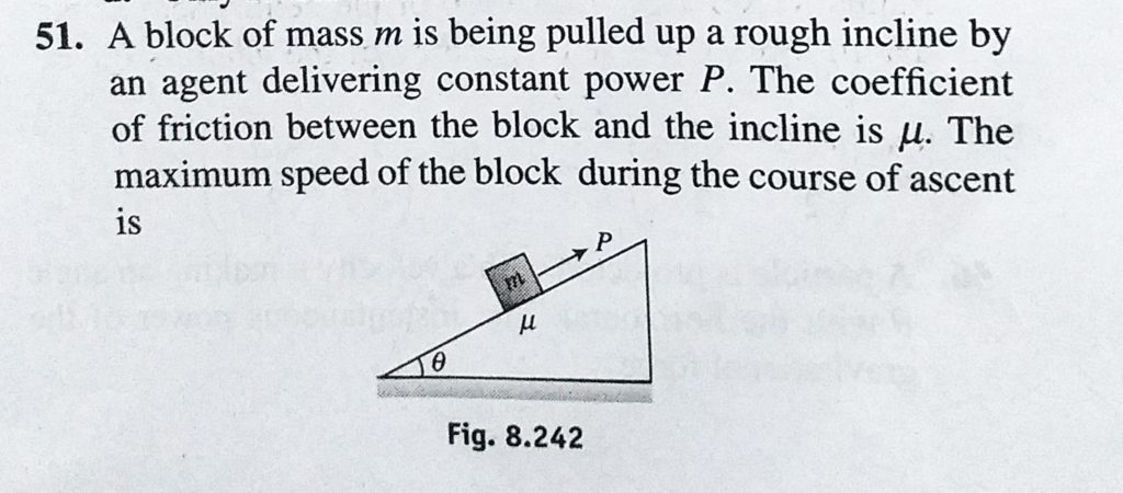 A block of mass m is being pulled up a rough incline by an agent delivering constant power P. The coefficient of friction between the block and the incline is mu. The maximum speed of the block during A block of mass m is being pulled up a rough incline by an agent delivering constant power P. The coefficient of friction between the block and the incline is mu. The maximum speed of the block during October 4, 2020 Category: Uncategorised (JEE Advanced Physics by BM Sharma + GMP Solutions) , Facebook Messenger WhatsApp Share this:TwitterFacebook Related