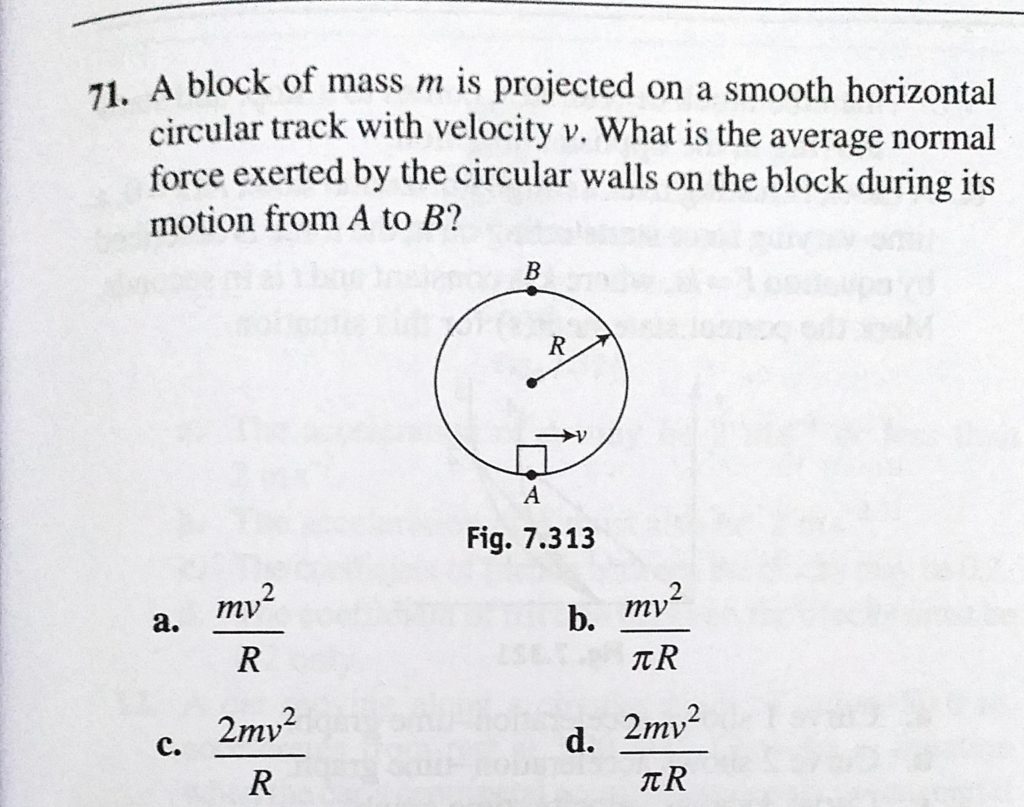 A block of mass m is projected on a smooth horizontal circular track with velocity v. What is the average normal force exerted by the circular walls on the block during its motion from A to B? A block of mass m is projected on a smooth horizontal circular track with velocity v. What is the average normal force exerted by the circular walls on the block during its motion from A to B? October 1, 2020 Category: Uncategorised (JEE Advanced Physics by BM Sharma + GMP Solutions) , Facebook Messenger WhatsApp Share this:TwitterFacebook Related