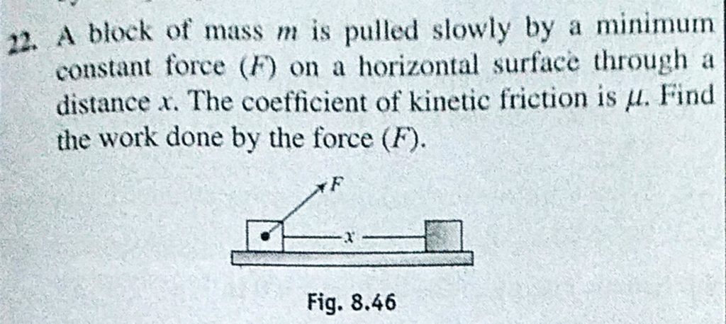 A block of mass m is pulled slowly by a minimum constant force (F) on a horizontal surface through a distance x. The coefficient of kinetic friction is mu. Find the work done by the force (F). A block of mass m is pulled slowly by a minimum constant force (F) on a horizontal surface through a distance x. The coefficient of kinetic friction is mu. Find the work done by the force (F). October 2, 2020 Category: Uncategorised (JEE Advanced Physics by BM Sharma + GMP Solutions) , Facebook Messenger WhatsApp Share this:TwitterFacebook Related