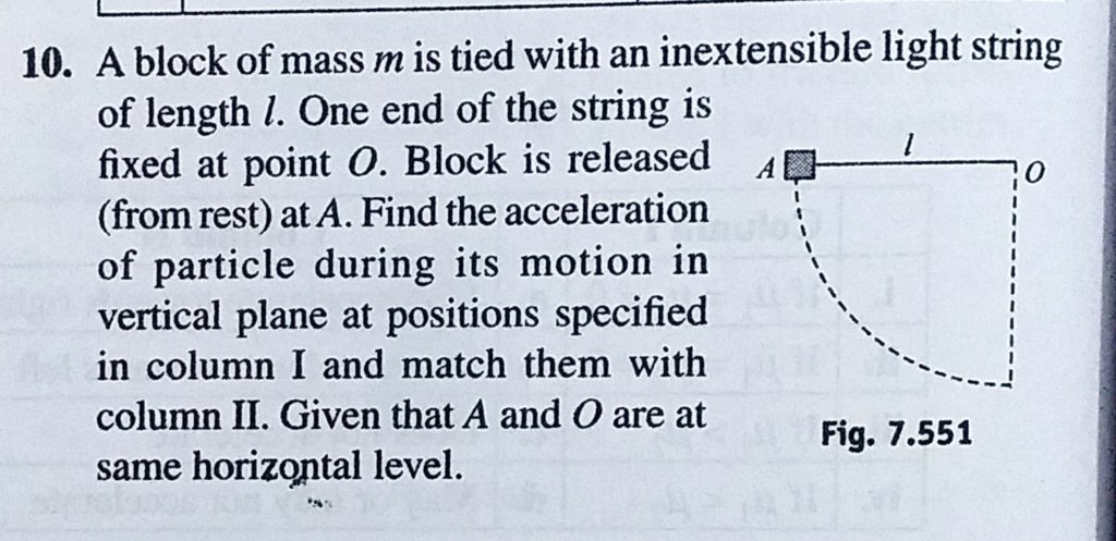 A block of mass m is tied with an inextensible light string of length l. One end of the string is fixed at point O. Block is released (from rest) at A. Find the acceleration of particle during its motion both the pulleys are massless and frictionless. A force F (of any possible magnitude ) is applied in horizontal direction. There is no friction between M and ground. For Fig. 7.348 October 2, 2020 Category: Uncategorised (JEE Advanced Physics by BM Sharma + GMP Solutions) , Facebook Messenger WhatsApp Share this:TwitterFacebook Related